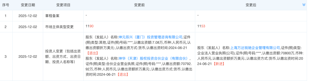 上海证券报记者查询发现,12月2日,烟台芝罘万达广场有限公司发生工商变更,坤华(天津)股权投资合伙企业(有限合伙)、坤元辰兴(厦门)投资管理咨询有限公司退出股东序列,新增万达商管旗下上海万达锐驰企业管理有限公司为全资控股股东。同时,高管团队相应进行调整。
